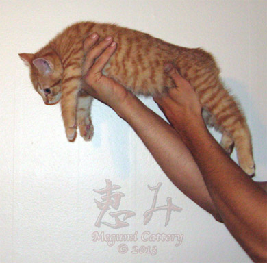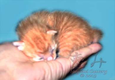 This is a red male kitten. He is content to curl up and nap in a hand.